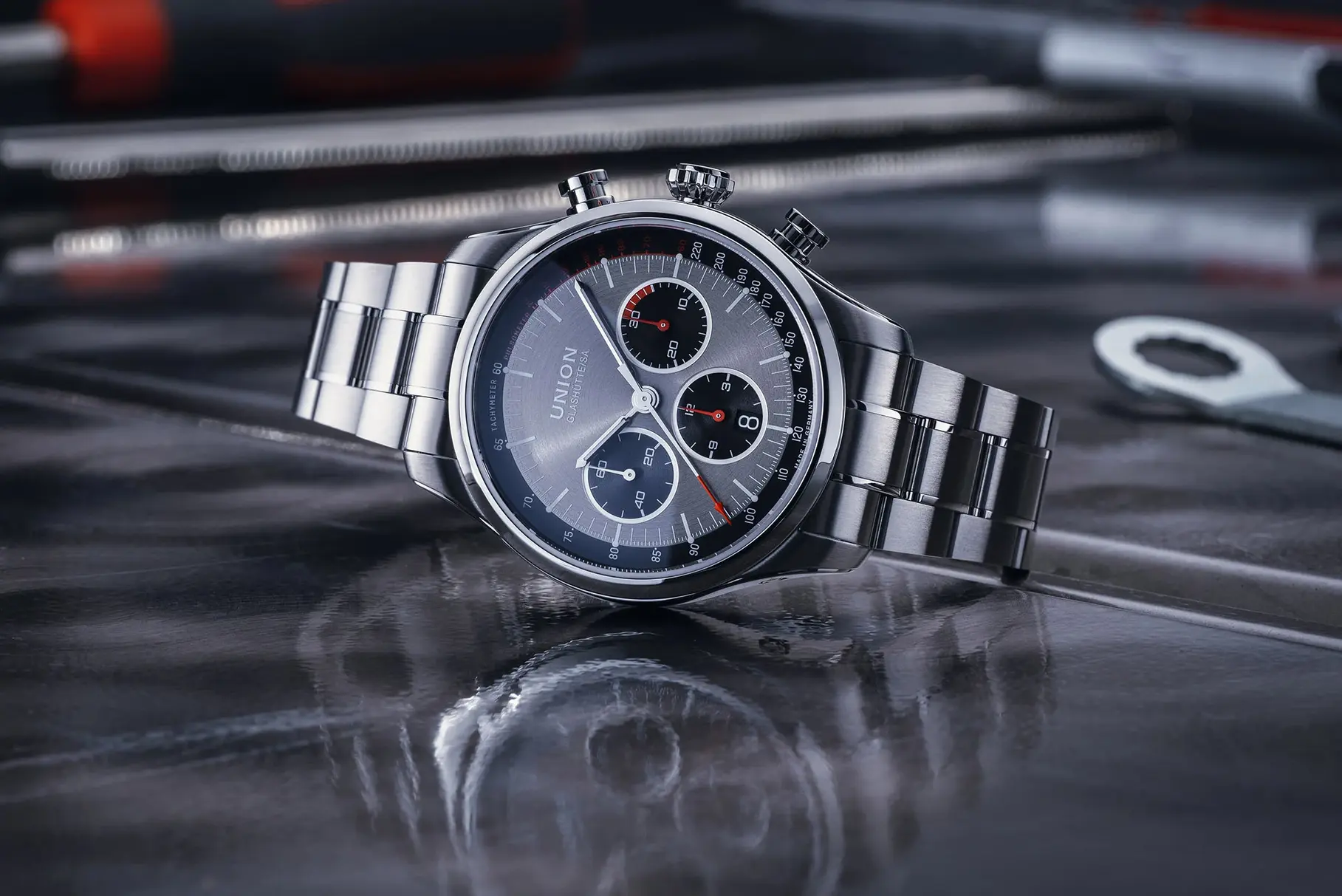 Серебристо-серый фон, будто лунная дорожка, контрастирует с черными субдиалами, обрамленными серебристыми кольцами. Красные акценты – как капли крови на снегу – приковывают взгляд к хронографу и пульсометру. Стрелки, покрытые светящимся составом, позволяют легко считывать время даже в кромешной тьме.
