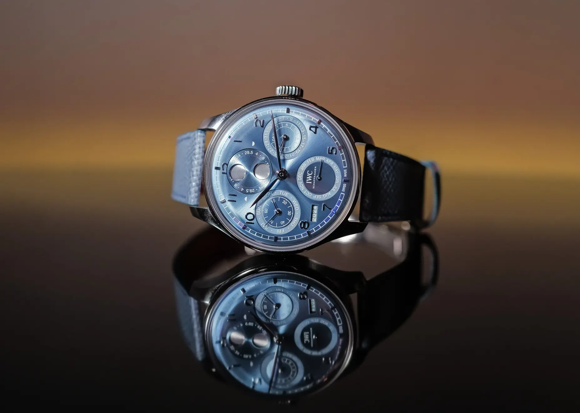 - Белое золото, градиентный ремешок, двойные лунные фазы.
