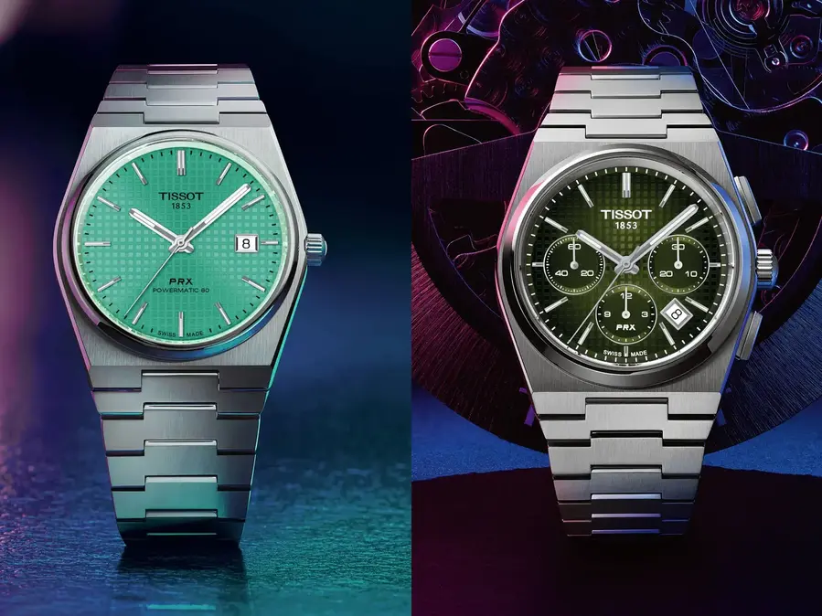 На этот раз Tissot выпустили три новые модели с зеленым циферблатом. Одна из них - PRX Automatic, которая ранее была доступна только с кварцевым механизмом. Циферблат имеет тот же дизайн, что и другие модели этой коллекции, с тисненым узором "таписери", нанесенными маркерами и стрелками с люминесцентным покрытием и окаймленным окном даты. Механизм, обеспечивающий 80 часов запаса хода, также остался без изменений. Часы имеют интегрированный браслет из нержавеющей стали, который можно легко заменить благодаря системе быстрого снятия.