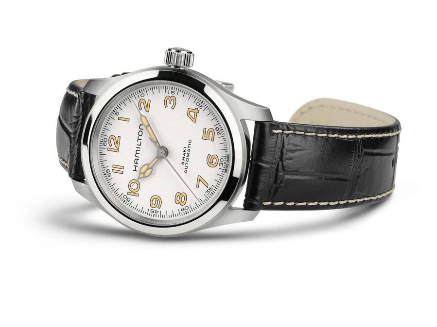 В случае с белым циферблатом Murph, он доступен в менее крупном размере корпуса 38 мм, и это просто обмен цветами. У черного Murph была винтажная особенность благодаря шрифту, используемому для цифр, и общей старомодной военной атмосфере. Новая версия идет дальше, добавляя бежевую люминесценцию на цифры и стрелки. Бежевые метки часа обрамлены черными линиями для повышения читаемости. Кроме белого Murph, Hamilton также представил возможность выбора браслета для черной версии, что значительно меняет внешний вид часов и, вероятно, расширит их привлекательность для широкой аудитории.
